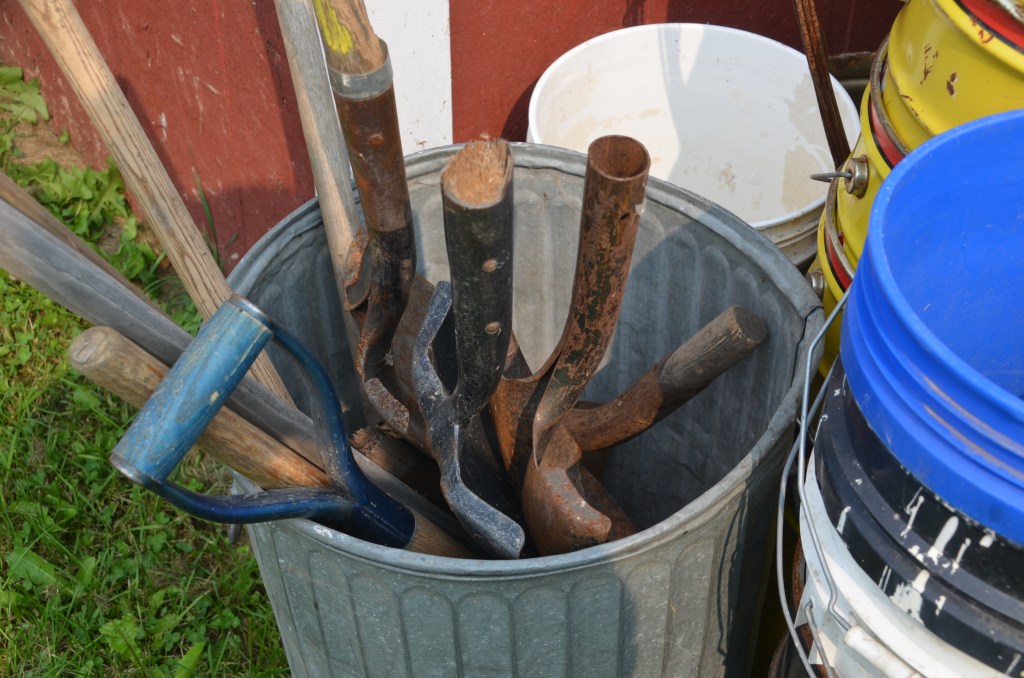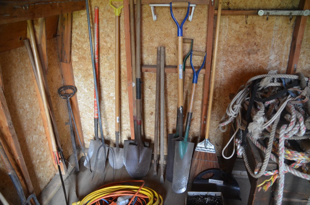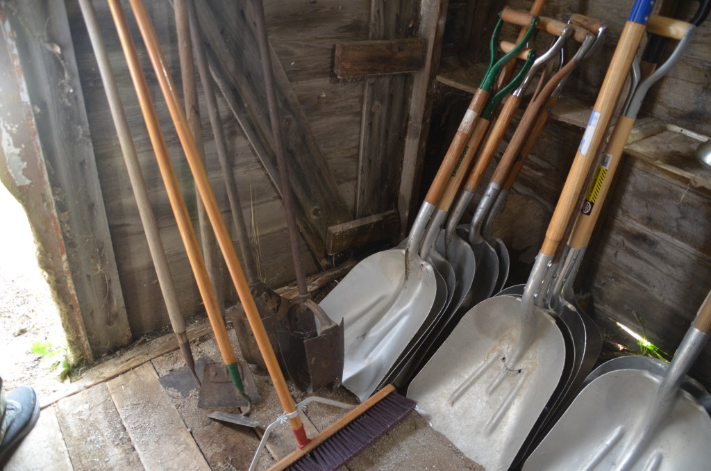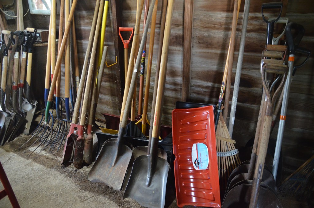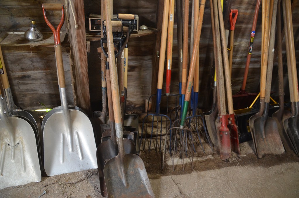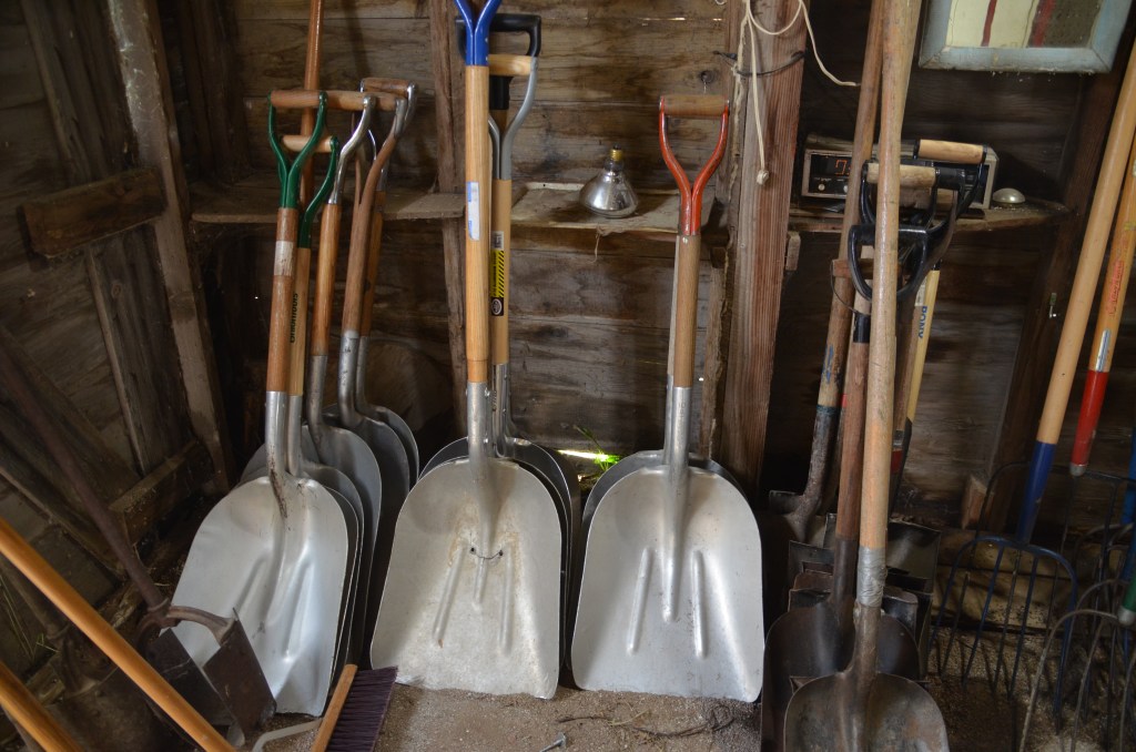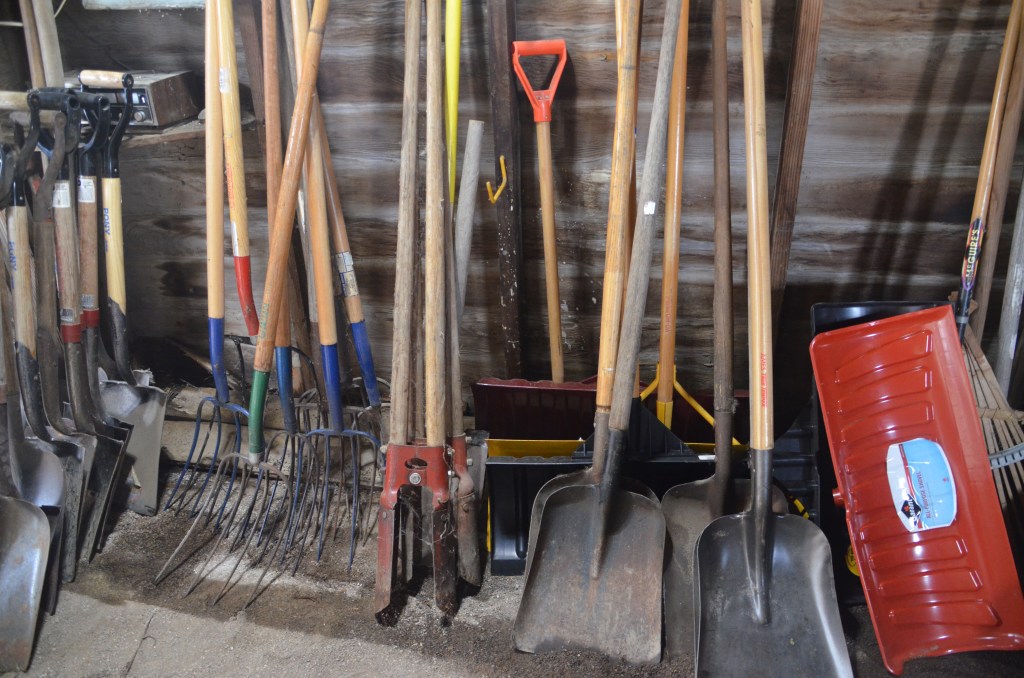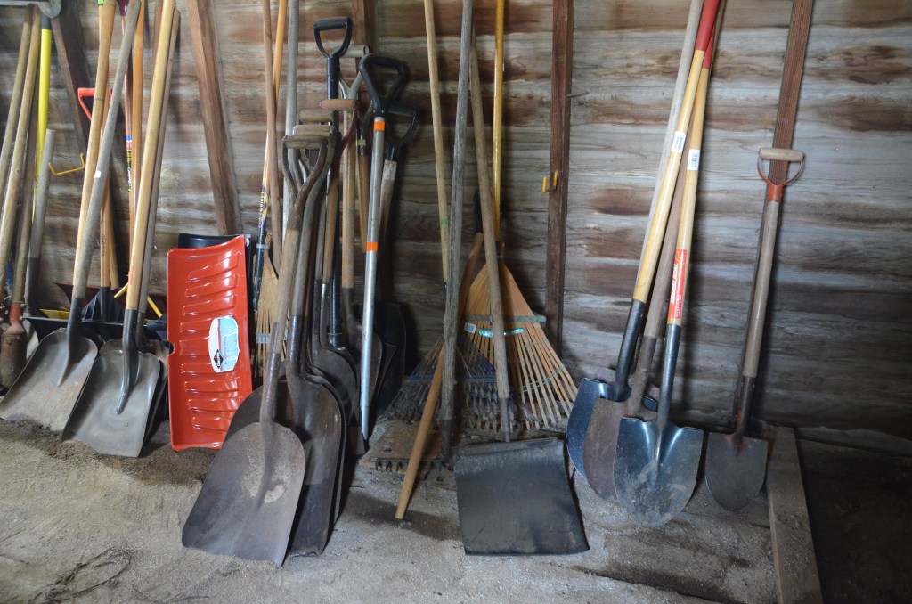 Shovels (snow, flat, round, scoop), post hole diggers, pitch forks